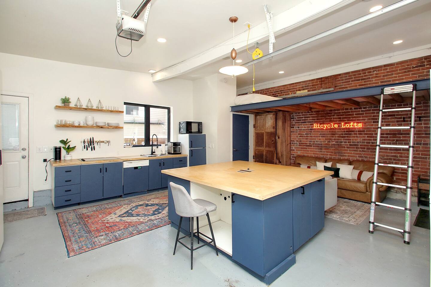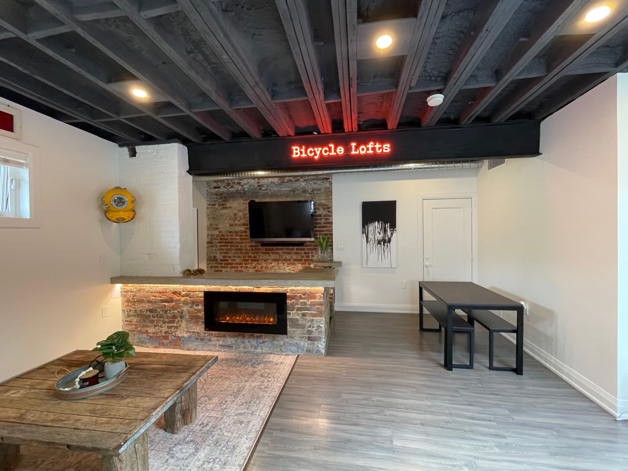 Exposed black-painted timber joists and a bold red neon "Bicycle Lofts" sign set the tone. A salvaged brick feature wall frames a sleek linear electric fireplace with floating countertop and warm LED underlighting. Wide-plank grey flooring completes a space that honors the building's original bones while delivering a polished, contemporary loft aesthetic.