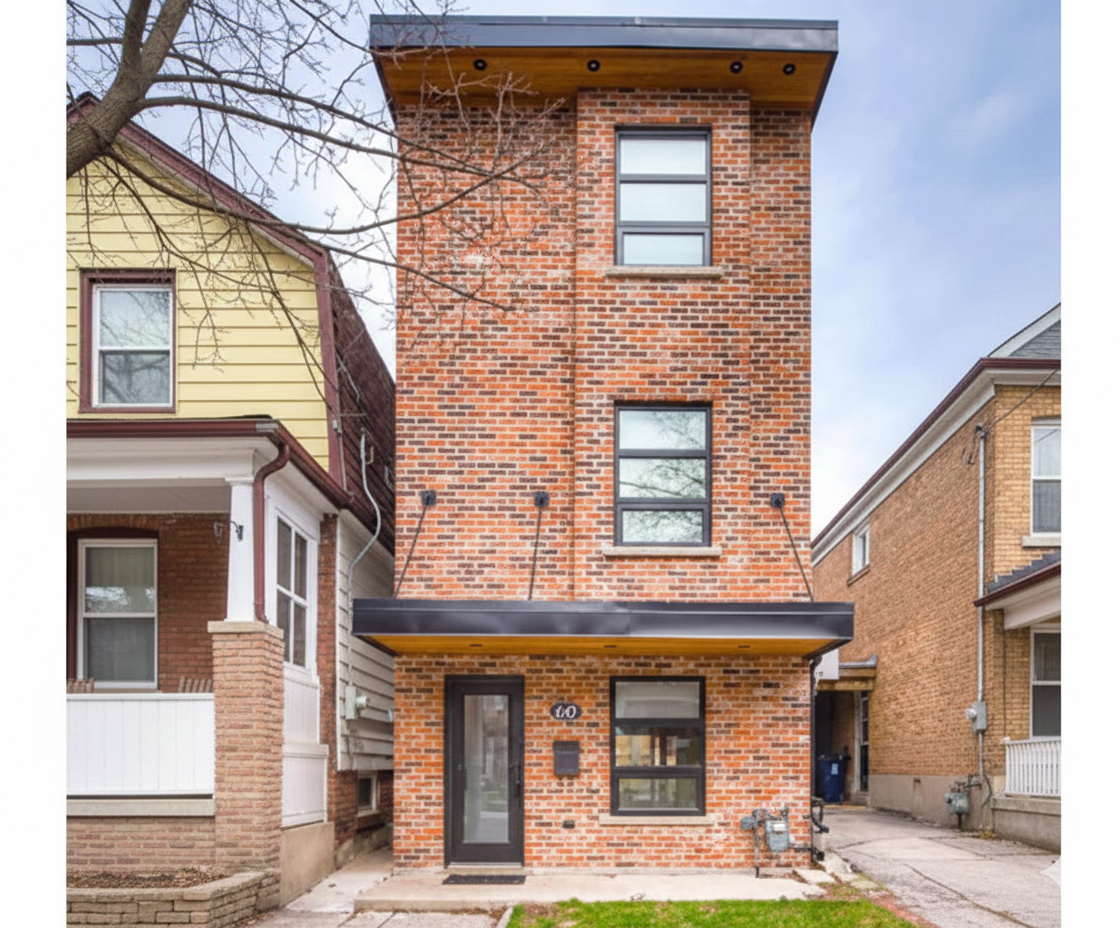 Restored 1889 cottage with added 2 new floors, doubled footprint. Urban loft architecture with barn board trim and wrought iron accents. Complete heritage restoration with modern expansion.