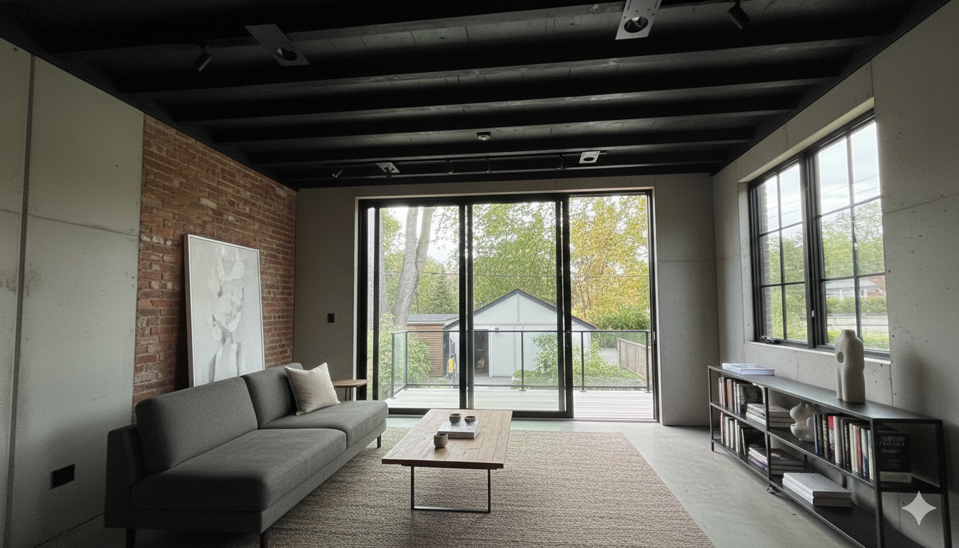 Compact industrial loft studio conversion featuring exposed 1920s brick walls, corrugated metal ceiling details, and polished concrete floors. A masterclass in maximizing open-concept living in a heritage industrial space.
